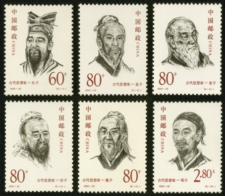 在中国古代春秋战国时期,文化、思想领域呈出现空前繁荣的局面,诸多学派、百家争鸣,产生了许多杰出的思想家,他们的成就对我国乃至东方的哲学思想发展产生了深远的影响,是中华民族思想史及人类思想史上的重要遗产。思想家是研究思想、思维和思考模式并且形成思想体系的人。中国古代思想中最有影响的原创性观念文化,主要是儒家和道家,它们相互对峙又相互吸收融合,成为春秋战国时期百家争鸣的重要篇章。2000年11月11日,国家邮政局发行2000—20《中国古代思想家》邮票,全套6枚,孔子、孟子、老子、庄子、墨子、荀子等六位先秦思想家作为第一组邮票首先亮相邮坛。这六位杰出的诸子大师,是我国古代哲学思想的开创者,他们的学说,对中国古代哲学思想和传统文化的发展都起过重大影响。 永远的“至圣先师”——孔子 孔子(前551年9月28日~前479年4月11日)名丘,字仲尼,春秋末期鲁国陬邑人,汉族。孔子是我国古代伟大的教育家和思想家,儒家学派创始人,世界文化名人。孔子的思想及学说对后世产生了极其深远的影响。他品格中的优点与缺点,几千年来影响着中国人,特别是影响着中国的知识分子。 民本思想的先驱者——孟子 孟子(前372年—前289年)(生于周烈王四年,卒于周赧王二十六年),汉族,山东邹城人。名轲,字子舆。又字子车、子居。父名激,母仉氏。中国古代伟大的思想家。战国时期儒家代表人物之一。著有《孟子》一书,属语录体散文集。《孟子》一书是孟子的言论汇编,由孟子及其弟子共同编写而成,记录了孟子言行的儒家经典著作。 生命的大智者——老子 老子(传说前600年左右—前470年左右),姓李名耳,字伯阳,汉族,楚国苦县人,是我国古代伟大的哲学家、思想家,道家学派创始人,世界文化名人。老子又名老聃,相传他一生下来就是白眉毛白胡子,所以被称为老子;老子生活在春秋时期,曾在东周国都洛邑任守藏史。他博学多才,孔子周游列国时曾到洛阳向老子问礼。老子晚年乘青牛西去,并在函谷关前写成了五千言的《道德经》。 积极而潇洒的退守者——庄子 庄子(约前369年—前286年),汉族。名周,字子休(一说子沐),战国时期宋国蒙(今安徽省蒙城县,又说今河南省商丘县东北民权县境内)人。著名思想家、哲学家、文学家,是道家学派的代表人物,老子哲学思想的继承者和发展者,先秦庄子学派的创始人。他的学说涵盖着当时社会生活的方方面面,但根本精神还是归依于老子的哲学。后世将他与老子并称为“老庄”,他们的哲学为“老庄哲学”。 墨子(公元前468 —公元前376),名翟(dí),汉族,我国战国初期宋国国都(今河南商丘)[1-2 ]或鲁国(今山东滕州)人。是战国时期著名的思想家、教育家、科学家、军事家,墨家学派的创始人及主要代表人物。后来其弟子收集其语录,完成《墨子》一书传世。墨子在先秦时期创立了以几何学、物理学、光学为突出成就的一整套科学理论。墨学在当时影响很大,与儒家并称“显学”,在当时的百家争鸣,有“非儒即墨”之称。墨子死后,墨家分为相里氏之墨、相夫氏之墨、邓陵氏之墨三个学派。 不是“醇儒”的荀子 荀子(xunzi)(前313年-前238年)名况,字卿,后避汉宣帝讳,改称孙卿。战国时期赵国猗氏(今山西新绛)人,著名思想家、文学家、政治家,儒家学派代表人物,时人尊称“荀卿”。他曾经传道授业,战国末期两位最著名的思想家、政治家——韩非、李斯都是他的入室弟子。 新浪收藏文交所频道 中国文化产权交易行业的同行者!