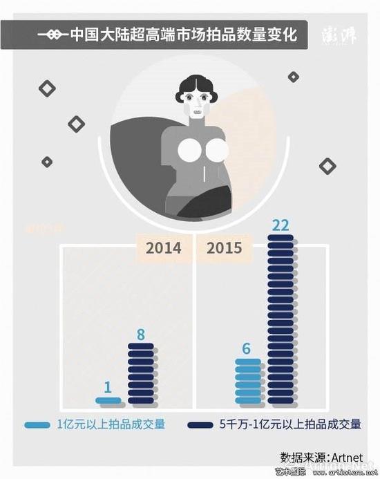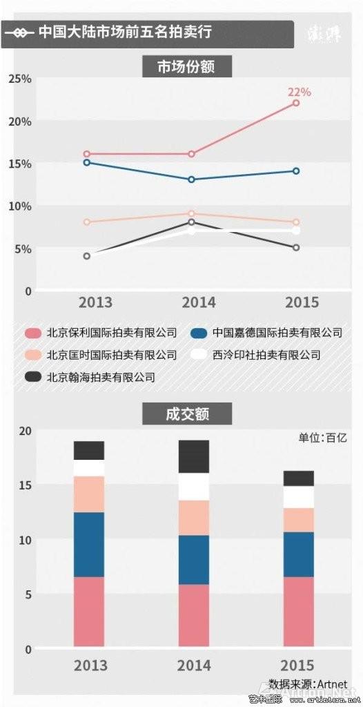 来源: artnet新闻 原标题:5张图带你读懂中国艺术品拍卖市场 2016年8月底,artnet与中国拍卖协会(CAA)共同发布第四份《中国文物艺术品全球拍卖统计年报》。图片:artnet 你可能知道华谊董事长王中军在去年以3.77亿人民币买下梵·高的油画《雏菊与罂粟花》,又在今年5月花了2.07亿元买下“唐宋八大家“之一曾巩现存唯一真迹《局事帖》,然后听他淡淡地表示,收藏是围绕个人爱好展开;或是看着中国首富王健林用2亿多人民币买下毕加索和莫奈的作品,高价藏品数量超过千件但从来没转手一件,并在接受采访时说,“我从来没想过要赚卖画那点儿小钱儿。” 然而,你或许不知道,王中军正在筹划将藏品放进私人美术馆,并已经成立自己的国际拍卖公司,正式进军艺术品投资领域;王健林也早把个人兴趣转向企业收藏,他背后是一个成熟的艺术收藏团队,在每次入手前都会进行详细的评估,他的书画收藏已经增值了1000倍,万达国际美术馆正在酝酿之中。 谈艺术只谈钱可能俗气,但是艺术品投资的确是大佬们越玩越转的游戏。 高端富裕阶层持续增加,艺术品天价也有“市” 从《2015世界财富报告》(World Wealth Report 2015)可以看到,王中军、王健林所在的中国超高资产净值群体(HNWIs)在2015年从89万位增加到103.4万位,在全球排名第四,仅次于美国、日本和德国,并且增长速度为16%,位居世界首位。(超高资产净值群体,指的是那些除去固定资产外,可投资资产超过100万美元的富豪们) 虽然2015年国内经济收到全球经济影响出现波动,但中国资本大佬逆势增加,中国艺术品超高端市场(单件超过5000万人民币)当然不用担心“有价无市“。 2015年中国大陆超高端市场拍品价格结构变化: 从买艺术品到卖艺术品,拍卖行也呈现“寡头化” 不满足于简单的入手、转手,王中军这些大佬们玩艺术品投资也有自己的花样。华谊兄弟创投在今年和保利拍卖、天辰时代成立了自己的拍卖公司——保利华谊(上海)国际拍卖有限公司,并计划在年底举办首次拍卖。 和王中军合作的北京保利国际拍卖有限公司是一家怎样的拍卖公司呢?它是中国文物艺术品在全球成交额最高的拍卖企业,历史成交额高达555.1亿元,近年来在国内市场份额稳居第一,并且又在2015年又增加了6%。 中国大陆市场前五名拍卖行市场份额变化: 排名第二的中国嘉德国际拍卖有限公司也很有来头,创始人陈东升是毛泽东外孙女孔东梅的丈夫,也是泰康人寿的董事长,而泰康人寿在最近收购了全球最大的拍卖行之一苏富比(Sotheby‘s)13.5%的股份,成为最大的股东。 成交额排名前五的拍卖企业的市场份额在过去三年中持续增长,从2013年的47%提高到2015年的56%,五家企业扎实地占据了市场半壁江山。 前五名拍卖企业市场份额: 相对低靡的中低端市场和中小拍卖行 然而,超高端市场的不俗表现不能弥补市场整体的下滑,受到国内经济形势影响,中国大陆文物艺术品拍卖市场总成交额同比减少19%,下调至291.3亿元人民币,跌破2012年低点。没有大佬支撑的国内中低端拍卖市场(单价100万人民币以下),更是呈现相对低靡的状态。 中低端拍卖品数量变化: 针对中低端拍卖市场的企业,日子自然也不好过。2015年,中国大陆共有274家企业举办中国文物艺术品拍卖,较上年减少了18家,这是近五年来中国大陆拍卖企业数量首次出现下降,减少或暂停拍卖的均为中小型拍卖企业。这种情况在拥有今年北京春拍中表现格外明显,据中国经济网报道,与去年同期相比,因为取消或延迟春拍的拍卖公司超过五成。 当然,这并非意味着中低端艺术品市场的颓靡,这些艺术品的买卖逐渐转向画廊、展厅,艺术品电商更是方兴未艾。艺术品市场不应仅仅是大佬们的游戏,培养大众审美情趣,艺术品“平民化“,才能创造更加健康的艺术市场。