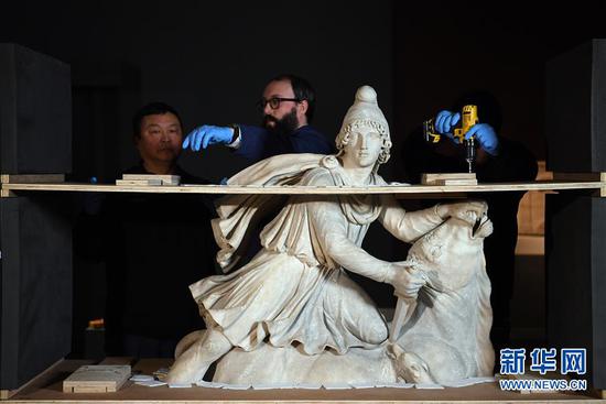 2月21日,工作人员开箱准备取出密特拉神像。 “大英博物馆100件文物中的世界史”将于3月2日起在中国国家博物馆向公众开放,目前正开箱布展。展览将展出大英博物馆丰富藏品中的100件(套)文物。新华社记者 金良快 摄