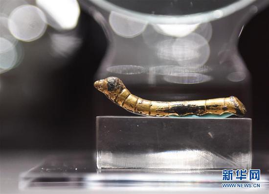 近日,千年“鎏金铜蚕”在北京国家大剧院东展厅展出。这条藏于陕西历史博物馆的“鎏金铜蚕”1984年出土于陕西石泉县,首尾共计9个腹节,体态为仰头或吐丝状,制作精致,造型逼真,此次随“唯寄歌舞寓长安”陕西古代乐舞文物特展在国家大剧院展出。