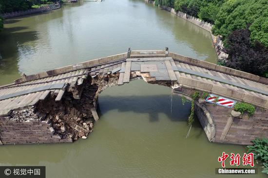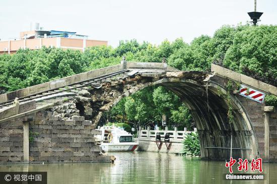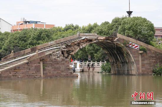 7月6日凌晨,浙江杭州欢喜永宁桥东北侧桥体,因多日暴雨导致桥梁金刚墙内填土吸水膨胀,东北侧金刚墙部分倒塌。 中新社记者 王刚 摄