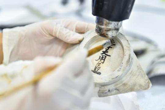 “在2009年,我们进行了一次试掘。把平面清出来以后,发现这个船真正的套在沉箱里,说明整体打捞是成功的。2011年进行了一次发掘,为大规模的发掘寻找一些数据和方法,随后做了三个方案进行综合比对,最后采取一个保守的方案进行发掘。”崔勇说:“目前船舱内的货物清理结束,证明这个发掘进入了一个节点。”